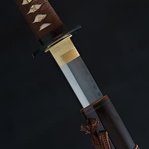 Forge Maru 1095, trempe sélective (véritable hamon), aiguisage à la main, saya marron (koiguchi, Kurigata et Kojiri en corne naturelle), ito et sageo marron