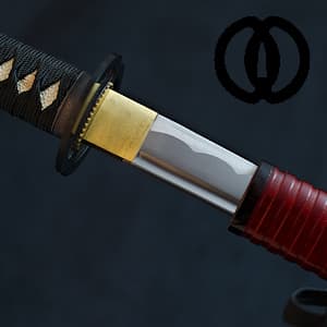 Forge Maru 1045, peinture lame (rouge et noir), aiguisage mécanique, saya bois naturel, ito et sageo noirs