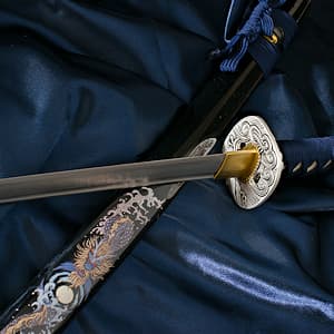Forge Maru 1045, aiguisage mécanique, saya noir avec sérigraphie (dragon), ito et sageo bleu foncé