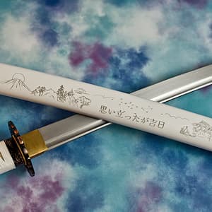 Forge Maru 1045, aiguisage mécanique, saya blanc gravé (paysage japonais), ito et sageo blancs